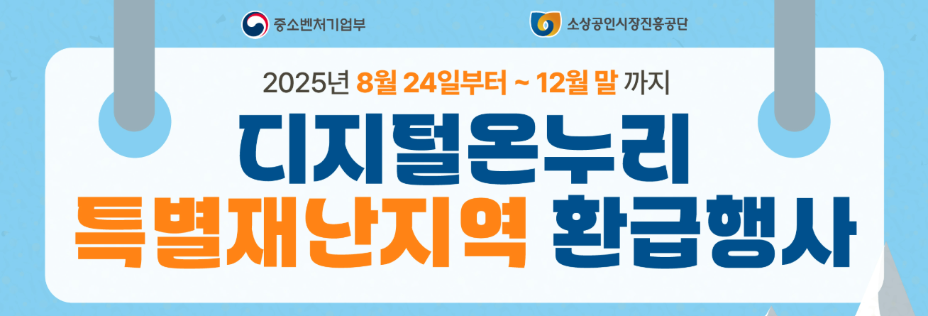 중소벤처기업부는 2025년 8월 24일(일)부터 12월 31일(수)까지 특별재난지역 전통시장에서 디지털 온누리상품권(모바일·카드형)으로 결제하면, 최대 20% 환급을 받을 수 있는 소비자 환급행사를 시행합니다.