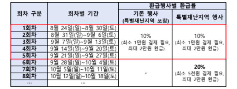 - 1~5회차 전국단위 환급행사(10%) + 특별재난지역 추가 10%