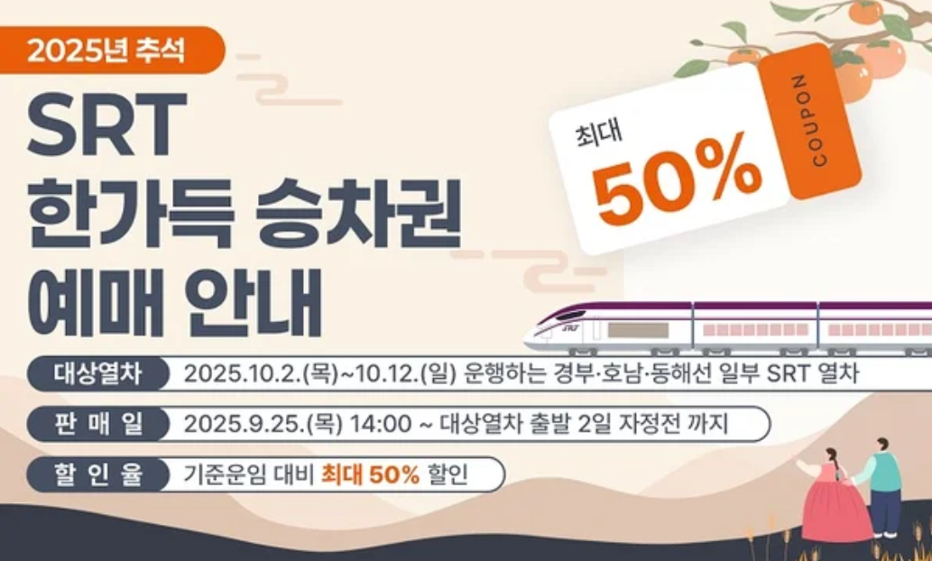 2025년 추석 특별수송기간(10월 2일~10월 12일)을 맞아, SRT에서 한가득 승차권 할인 프로모션을 진행했습니다. 최대 50%까지 할인된 가격으로 기차표를 예매할 수 있는 절호의 기회였는데요, 이미 예매는 종료되었지만 취소표 확인과 SRT 앱 알림 기능을 활용하면 여전히 좌석 확보가 가능합니다. 또한 이번 경험을 바탕으로 내년 명절 예매를 준비하는 데에도 큰 도움이 될 수 있습니다.